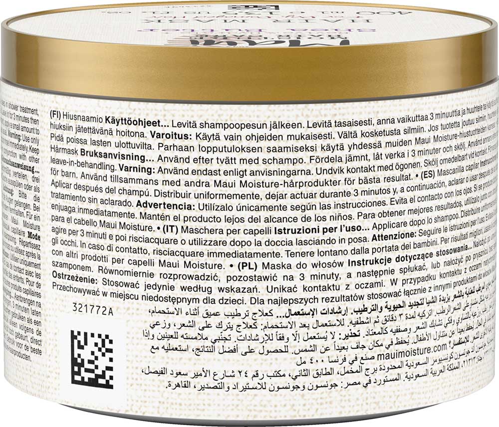 ماسک آبرسان موی شی باتر مائوئی مویسچر Maui Moisture Shea Butter محصولی باکیفیت و حاوی شی باتر کرمی به همراه روغن نارگیل غنی و روغن ماکادمیای (فندق استرالیایی) خالص جهت تغذیه و آبرسانی عمیق مو و احیای سلامتی آن می باشد. این فرمول به طور عمیق رطوبت از دست رفته موهای خشک را مجددا پر می کند و نرمی و شادابی موهای آسیب دیده را احیا می کند، نتیجه موهایی سالم و سرزنده با نمای شاداب و نرم می باشد. ماسک موی شی باتر مائوئی مویسچر فاقد سولفات، سیلیکون، پارابن و گلوتن است و فرمول کاملا گیاهی و وگن دارد.