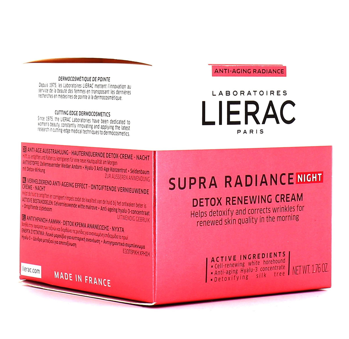 کرم نوسازی و سم زدای شب لیراک Lierac Supra Radiance Night دارای فرمول نوآورانه بر پایه پزشکی تغذیه ای و محیطی برای ایجاد رنگ یکنواخت پوست، هموار سازی چروک ها و سم زدایی در طی زمان استراحت در شب می باشد. کرم شب لیراک سوپرا رادیانس حاوی عصاره گیاه Horehound (گندنای کوهی) برای سم زدایی سلولی، جلوگیری از تشکیل سموم جدید و فعالسازی مجدد متابولیسم سلولی است.