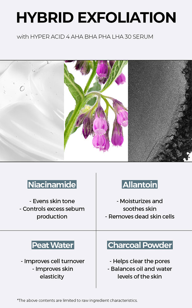 Water, Gluconolactone, Lactic Acid, Methylpropanediol, Glycolic Acid, Potassium Hydroxide, 1,2-Hexanediol, Diethoxyethyl Succinate, Glycerin, Xanthan Gum, Polyglyceryl-10 Laurate, Acacia Senegal Gum, Polyglyceryl-10 Myristate, Glyceryl Caprylate, Niacinamide, Salicylic Acid, Allantoin, Disodium EDTA, Ethylhexylglycerin, Peat Water, Citric Acid, Hydroxypropyl Methylcellulose, Capryloyl Salicylic Acid, Butylene Glycol, Potassium Sorbate, Charcoal Powder