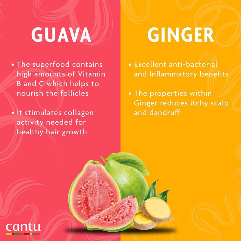 لوسیون پاکسازی پوست سر قبل از شامپوی کانتو Cantu Guava Ginger دارای فرمول ویژه برای پاک کنندگی چربی اضافه، بلند کردن آلودگی ها، بقایای مواد حالت دهنده و ناخالصی ها از روی پوست سر و حذف ملایم پوست مرده به منظور آماده سازی پوست سر برای شامپو و تقویت سلامتی مو و پوست سر است. این فرمول حاوی عصاره گواوا و زنجبیل برای انرژی بخشی و تقویت فولیکول مو و روغن ریشه زردچوبه و سرکه پوره سیب به عنوان لایه بردار طبیعی برای تصفیه و خالص سازی پوست سر است.
