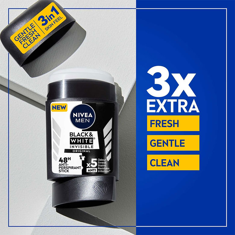 Nivea Men Black and White Invisible 3in1 Skin Feel Gentle Fresh Clean Anti Perspirant Stick