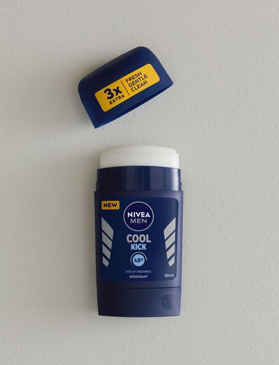 استیک دئودورانت آقایان نیوا Nivea Men Cool Kick دارای فرمول جدید برای مراقبت 48 ساعت زیر بغل به همراه ملایمت بر روی پوست و خنک کنندگی طولانی مدت می باشد. استیک کول کیک دارای فرمول بدون آلومینیوم برای مراقبت از پوست حساس و حاوی روغن آووکادو برای تغذیه و حفظ لطافت پوست است. این ترکیب به وسیله سه ویژگی ملایمت بر روی پوست، تازگی بخشی و احساس تمیزی، مراقبت پیوسته زیر بغل را به ارمغان می آورد.