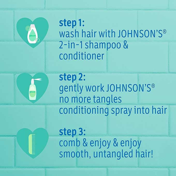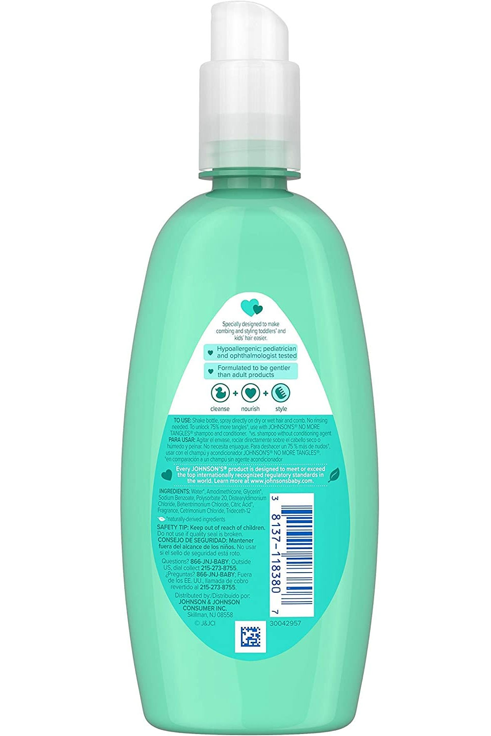 اسپری موی کودک جانسون No More Tangle دارای فرمول ویژه برای شانه کشی آسان، باز کردن گره موهای آشفته، منظم کردن و تغذیه موهای کودکان از ریشه تا انتها می باشد. اسپری مغذی موی جانسون حاوی 98 درصد عصاره های طبیعی بوده و تست شده توسط متخصصین پوست، کودک و چشم است و موهایی تغذیه شده و مدیریت پذیر را به ارمغان می آورد.