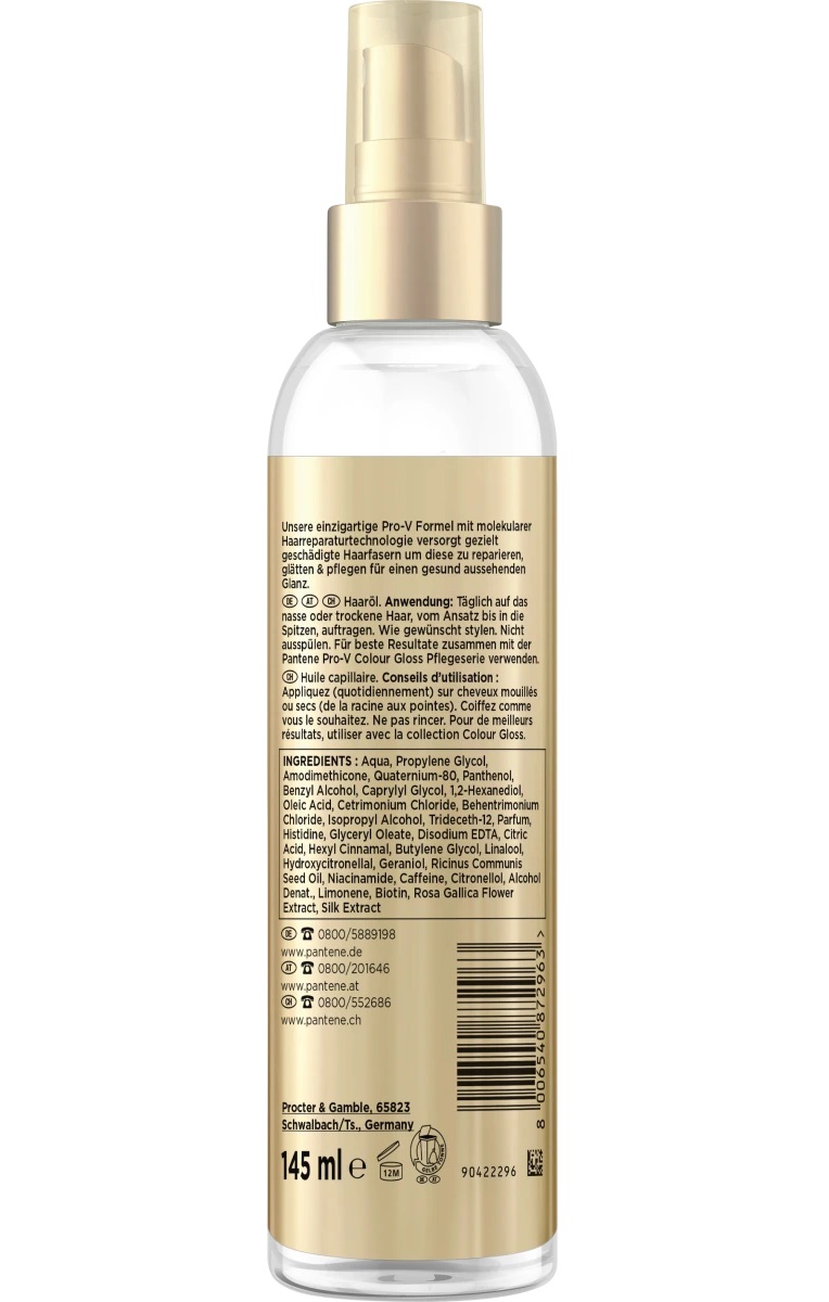 اسپری براق کننده موی پنتن Pantene 3 Seconds Gloss دارای فناوری ترمیم ملکولی برای بازسازی تارهای آسیب دیده مو و عملکرد قدرتمند و سریع 3 ثانیه ای است. این ترکیب همچنین حاوی نیاسین آمید، بیوتین، مواد معدنی براق کننده مو و پرو ویتامین B5 برای ترمیم و احیای سرزندگی و درخشندگی زیبای موها است. اسپری سه ثانیه ای پنتن بدون ایجاد سنگینی موهایی محافظت شده با رنگ براق را به ارمغان می آورد.