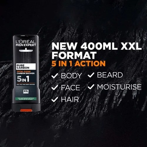 ژل دوش آقایان لورال کربن LOreal Total Clean غنی شده با ذرات فعال کربن زغال برای جذب بوی عرق و پاک کنندگی کامل پوست به همراه 5 عملکرد شوینده بدن، مو، صورت، اصلاح و رطوبت رسانی است. ژل دوش لورال باعث احساس شادابی و تمیزی پیوسته در طول روز می شود.