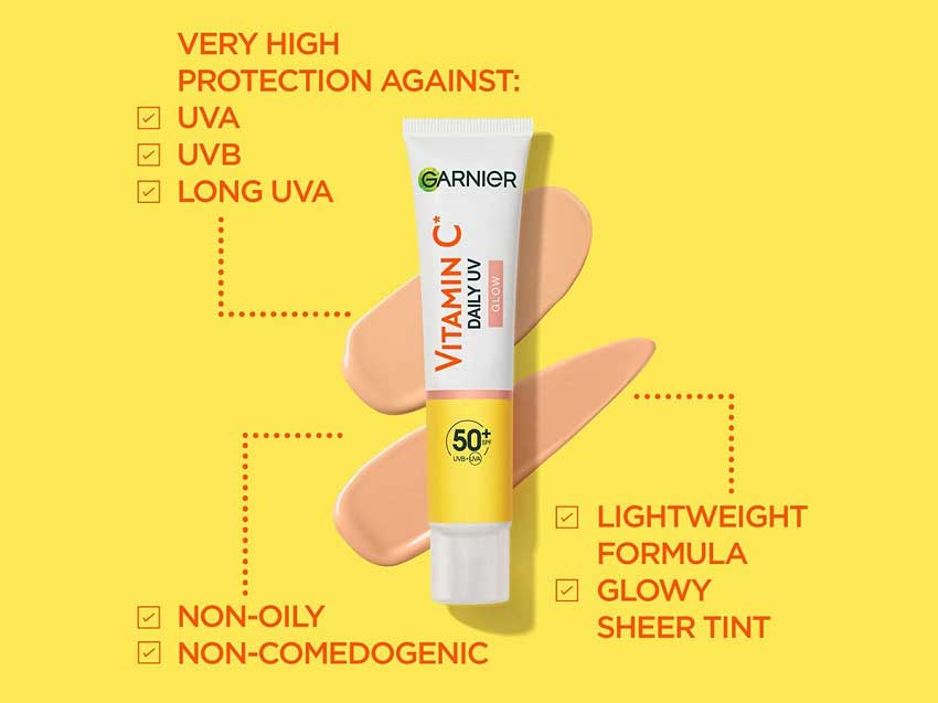 فلویید ضدآفتاب و ضد لک رنگی ویتامین سی گارنیه Garnier Vitamin C دارای فرمول محافظت کننده قوی در برابر پرتوهای UVA، UVB و Long UVA و جلوگیری کننده از ایجاد لک ناشی از آفتاب به همراه اثر محو لک و روشن کنندگی پوست می باشد. فلویید ضدآفتاب گارنیه دارای بافت سبک و حاوی ویتامین سی برای روشن کنندگی و رنگدانه های معدنی با قابلیت انطباق با انواع رنگ پوست و ایجاد نمای نهایی طبیعی، هموار و درخشان صورت است. فرمول ضدآفتاب گارنیه با ویتامین E به عنوان آنتی اکسیدان محافظت کننده و ضد پیری و نیاسین آمید با قابلیت ضدلک و ضدجوش همراه شده است.