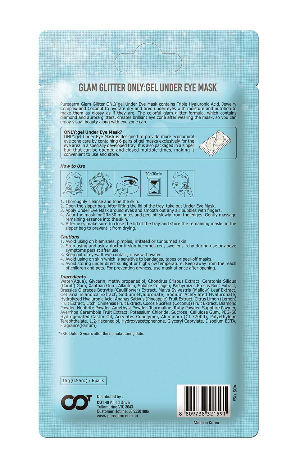 ماسک درخشان کننده و آبرسان زیر چشم پیوردرم Purederm Glam Glitter دارای فرمول ویژه با سه عملکرد آبرسانی، درخشان کنندگی و روشن کنندگی است. ماسک ورقه ای زیر چشم پیوردرم حاوی سه نوع هیالورونیک اسید برای آبرسانی قوی و پودر جواهرات از جمله پودر الماس، یاقوت و سنگ مرمر آرورا برای درخشش و نمای نورانی چشم ها است. ماسک پیوردرم همچنین حاوی عصاره نارگیل و آناناس برای تغذیه پوست و عصاره لیمو برای روشن کنندگی زیر چشم است.