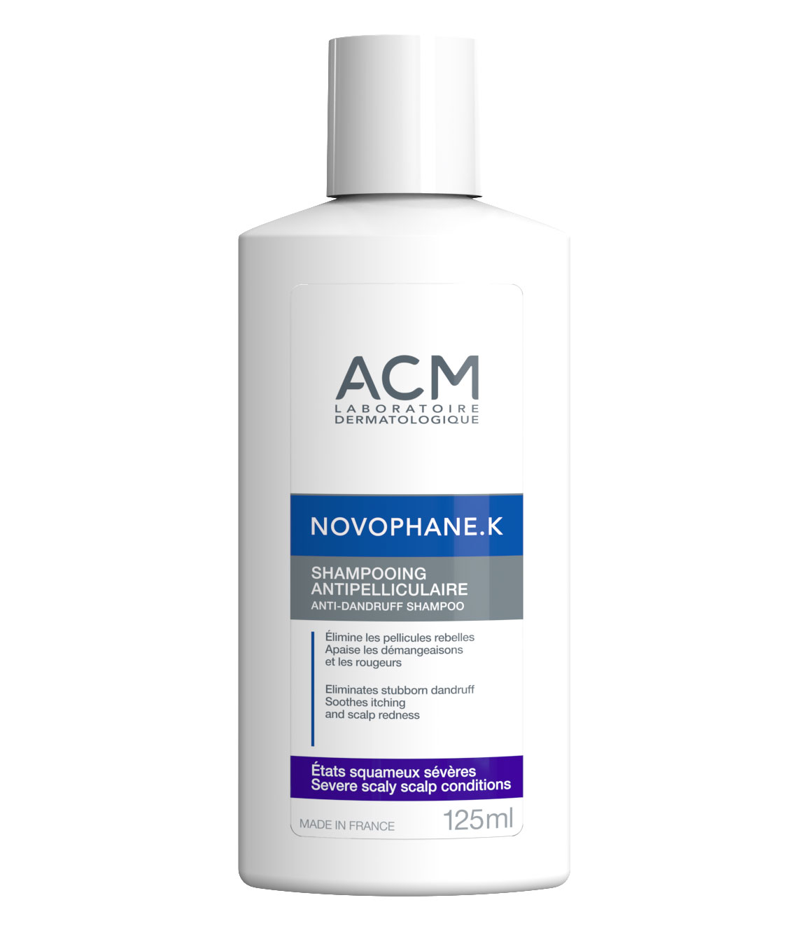 شامپو ضدشوره ای سی ام نووفن کا ACM Novophane K دارای عملکرد جامع برای مبارزه همه جانبه با شوره سر شدید همراه با خارش است. شامپو ضد شوره نووفن حاوی کمپلکس ضد قارچ متشکل از پیریتیون، زینک و پیروکتون اولامین است که تکثیر مخمر مالاسزیا، عامل اصلی ایجاد شوره سر را محدود می کند. این فرمول همچنین حاوی روغن درخت ارس برای پاکسازی شوره سر و جلوگیری از بازگشت آن است و توسط سالیسیلیک اسید پوسته ها را از بین می برد، پوست سر پاک می شود و خارش برطرف می گردد.