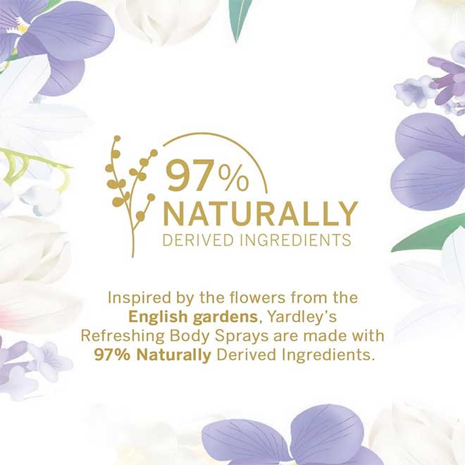 اسپری خوشبوکننده بدن لاوندر انگلیسی یاردلی Yardley English Lavender حاوی 97 درصد ترکیبات بدست آمده با منشاء طبیعی و دارای رایحه دلپذیر بدست آمده از لاوندر دست چین شده از باغ های انگلیسی با امضای یاردلی است و حس تازگی و آسودگی را در تمام طول روز به ارمغان می آورد. نت های اسپری یاردلی شامل لاوندر، رزماری، سدر، گل شمعدانی، دانه تونکا، مشک و گلسنگ است.