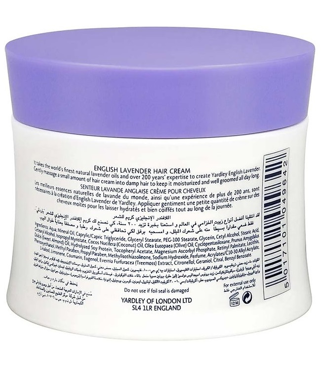 کرم موی لاوندر یاردلی Yardley English Lavender حاوی عصاره های طبیعی برای تغذیه، رطوبت رسانی و مراقبت از لطافت موها در طول روز می باشد. کرم موی یاردلی حاوی لاوندر انگلیسی و روغنهای بادام، نارگیل و زیتون است که مو را تغذیه و لطیف می کند. این فرمول همچنین حاوی ویتامین ای، ویتامین A و پروتئین سویا هیدرولیز شده برای تقویت موها است و توسط رایحه ملایم لاوندر به آرامش و متعادل کردن ذهن کمک می کند.