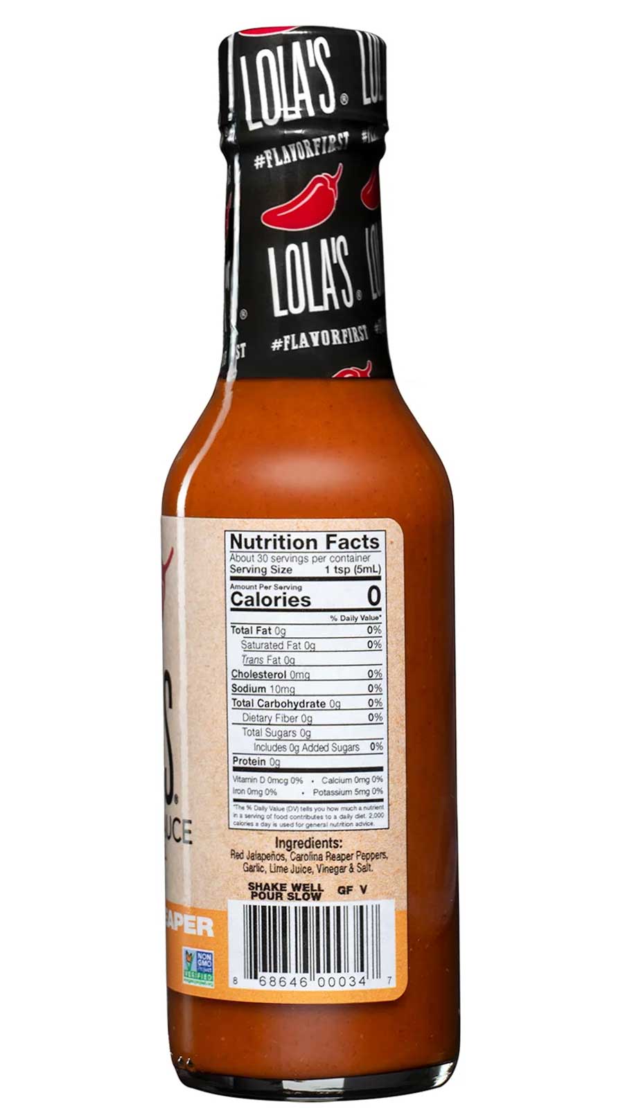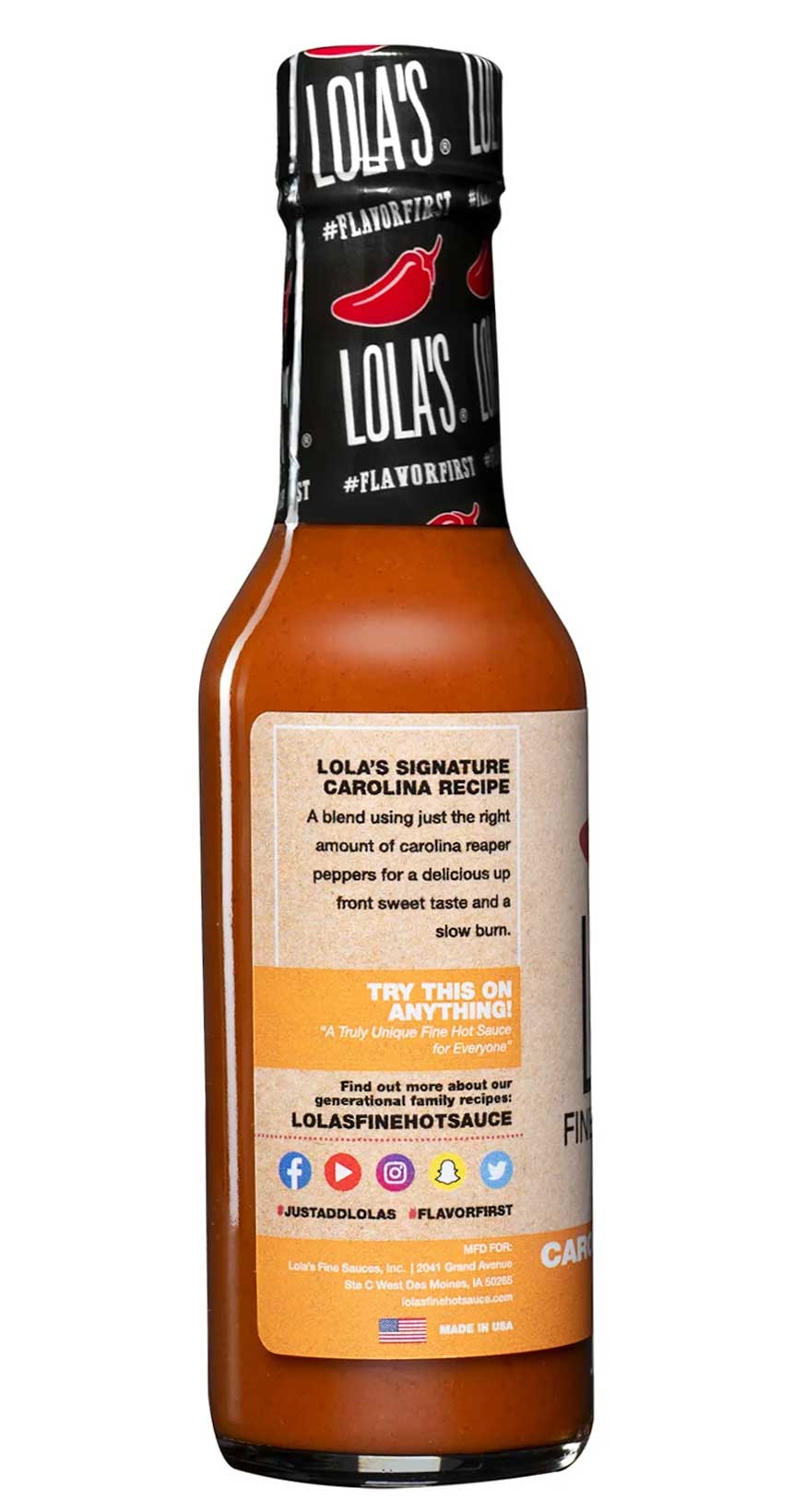 سس تند فلفل کارولینای لولاز Lolas Carolina Reaper دارای ترکیب کاملا طبیعی و حاوی فلفل کارولینا (تندترین فلفل جهان) با میزان تندی 2 میلیون واحد اسکویل و فلفل هالاپینوی قرمز است. میزان دقیق و بالانس شده از این دو فلفل باعث ایجاد تعادل میان طعم و حرارت شده است. سس تند لولاز همچنین حاوی سیر، لیمو، سرکه و نمک است و دارای فرمول وگن می باشد.