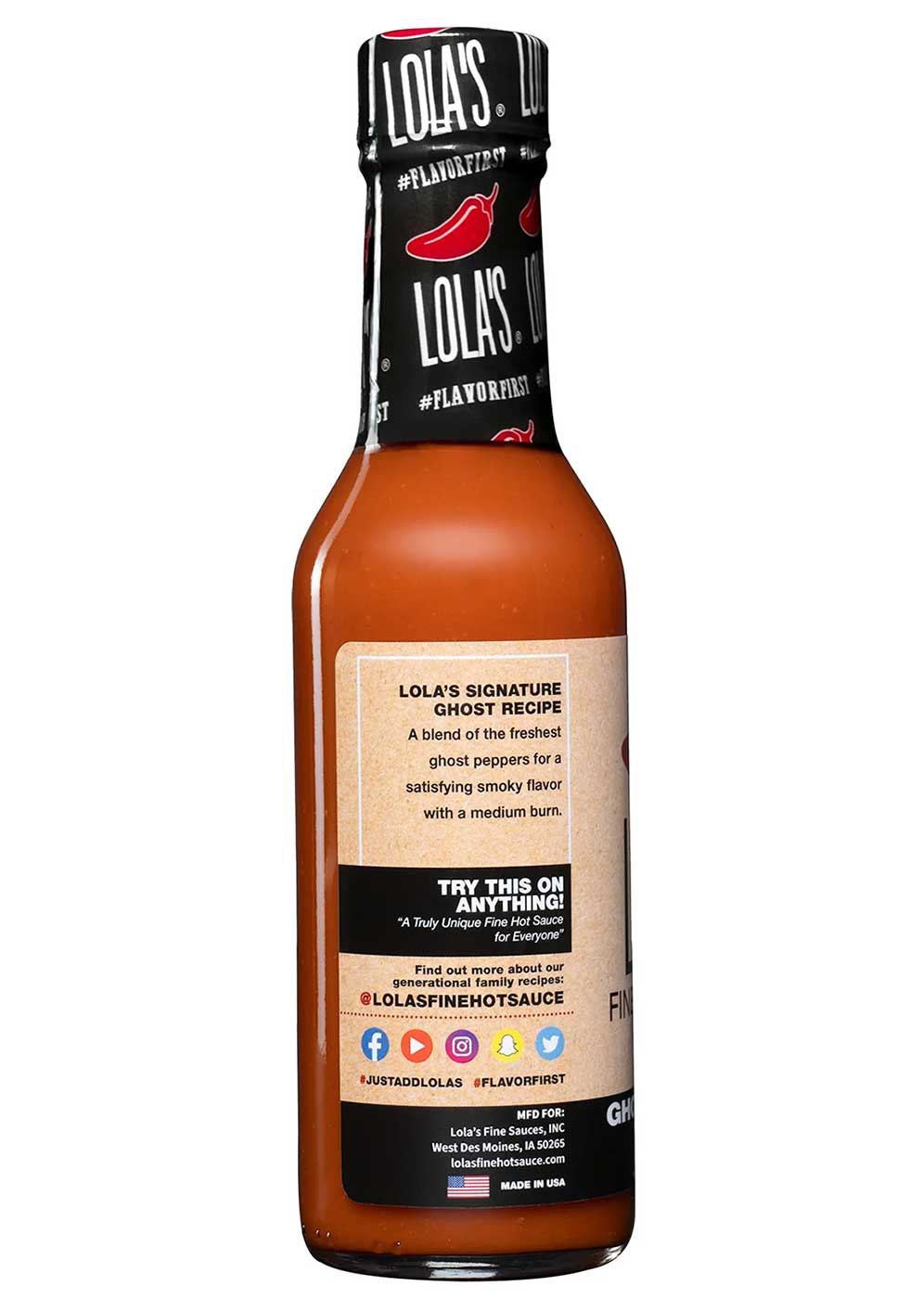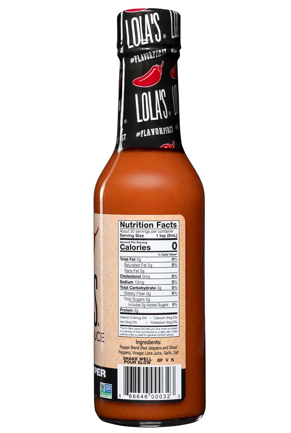 سس تند فلفل گوست لولاز Lolas Ghost Pepper دارای ترکیب کاملا طبیعی و حاوی فلفل گوست (فلفل شبح) با میزان تندی بالای 1 میلیون واحد اسکویل و فلفل هالاپینوی قرمز با تندی 2500 تا 8000 واحد اسکویل است. میزان دقیق و بالانس شده از این دو فلفل باعث ایجاد تعادل میان طعم و حرارت شده است. سس تند لولاز همچنین حاوی سیر، لیمو، سرکه و نمک است و دارای فرمول وگن می باشد.