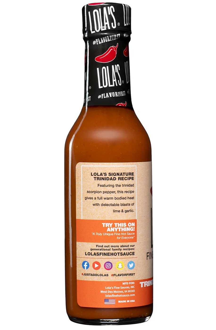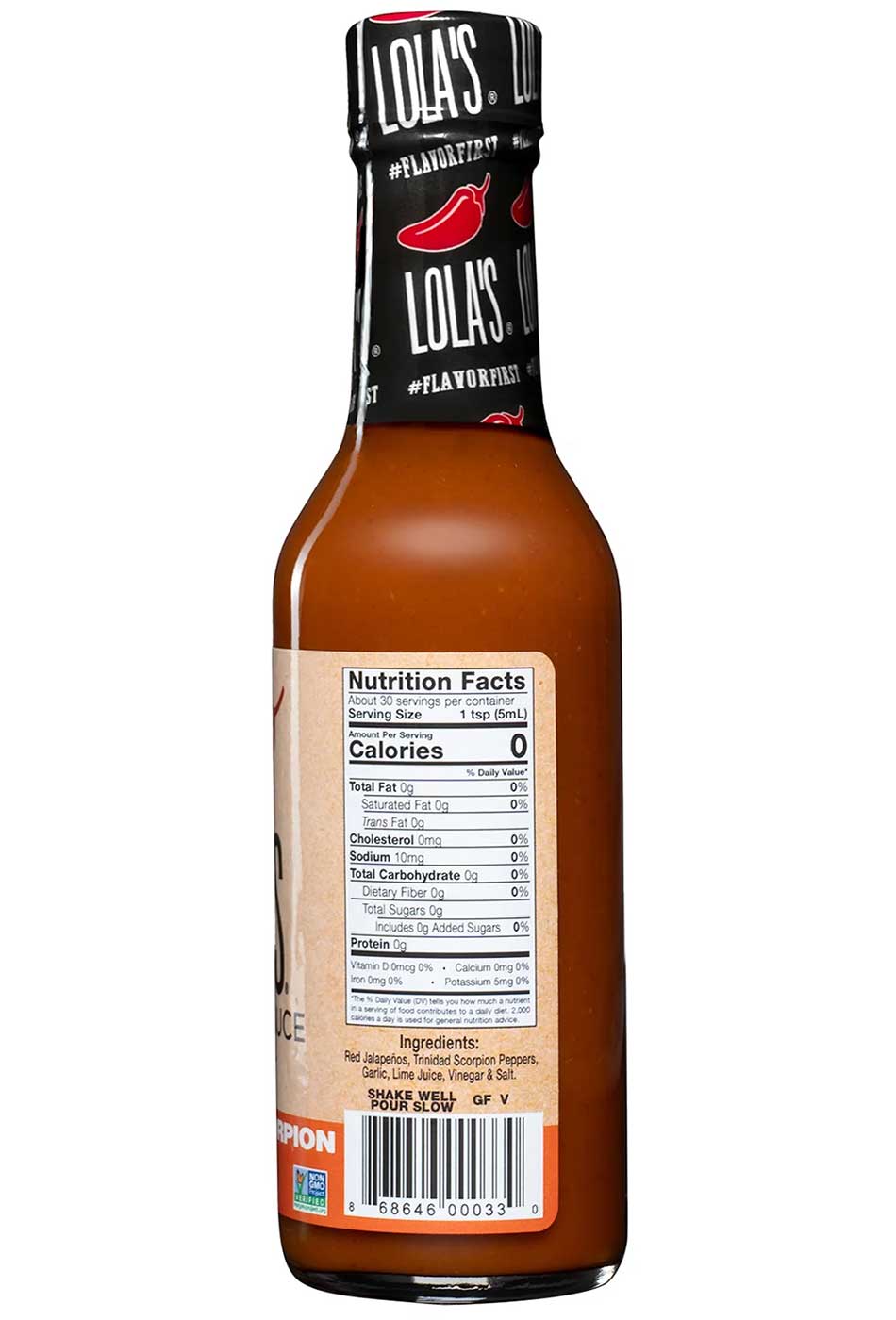 سس تند فلفل ترینیداد اسکورپیون لولاز Lolas Trinidad Scorpion دارای ترکیب کاملا طبیعی و حاوی فلفل ترینیداد اسکورپیون با میزان تندی 1.2 میلیون واحد اسکویل و فلفل هالاپینوی قرمز با تندی 2500 تا 10000 واحد اسکویل است. میزان دقیق و بالانس شده از این دو فلفل باعث ایجاد تعادل میان طعم و حرارت شده است. سس تند لولاز همچنین حاوی سیر، لیمو، سرکه و نمک است و دارای فرمول وگن می باشد.