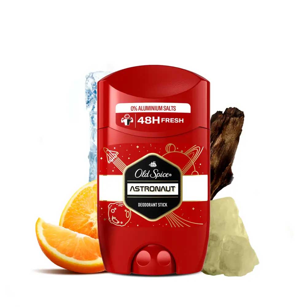 استیک دئودورانت اولد اسپایس استرونوت Old Spice Astronaut محافظت کننده 48 ساعته خشکی و تازگی زیر بغل به همراه تکنولوژی مقاومت در برابر محو شدن رایحه جهت حس شادابی و تازگی طولانی مدت می باشد. استیک دئودورانت استرونوت (فضانورد) دارای بافت آبی رنگ و بدون ایجاد نشانه های سفید روی لباس است و همراه با رایحه پرتقال، ترنج، صمغ، رایحه های دریایی و رایحه های چوبی احساس شادابی پیوسته را فراهم می کند.