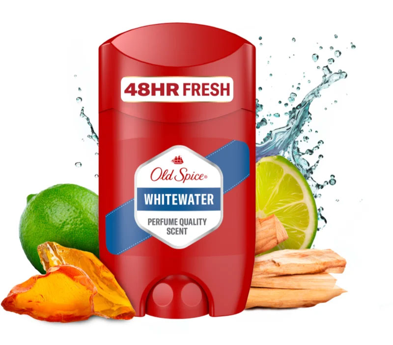استیک دئودورانت اولد اسپایس وایت واتر Old Spice Whitewater محافظت کننده 48 ساعته خشکی و تازگی زیر بغل به همراه تکنولوژی مقاومت در برابر محو شدن رایحه جهت حس شادابی و تازگی طولانی مدت می باشد. استیک دئودورانت وایت واتر دارای بافت آبی رنگ و بدون ایجاد نشانه های سفید روی لباس است و همراه با رایحه دریایی، لیمو، ترنج، چوب و کهربا احساس شادابی پیوسته را فراهم می کند.