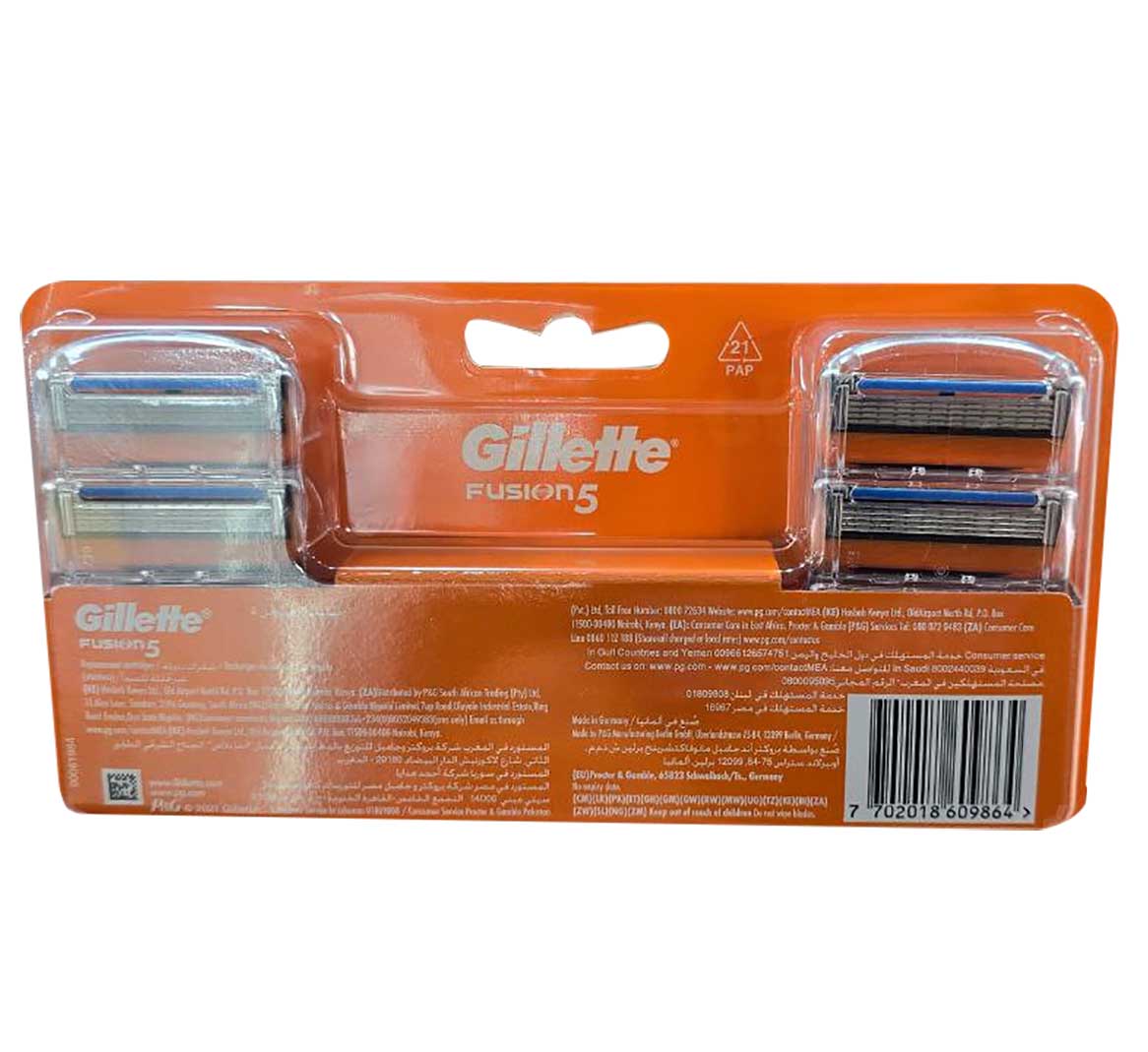 تیغ اصلاح یدک ژیلت فیوژن Gillette Fusion5 دارای تکنولوژی اصلاح 5 تیغه به کمک نوار ژل مرطوب کننده با آلوئه ورا می باشد. تیغ اصلاح یدک ژیلت فیوژن همچنین دارای یک تیغه اصلاح دقیق در پشت کارتریج برای نقاط حساس صورت و خط گرفتن می باشد.