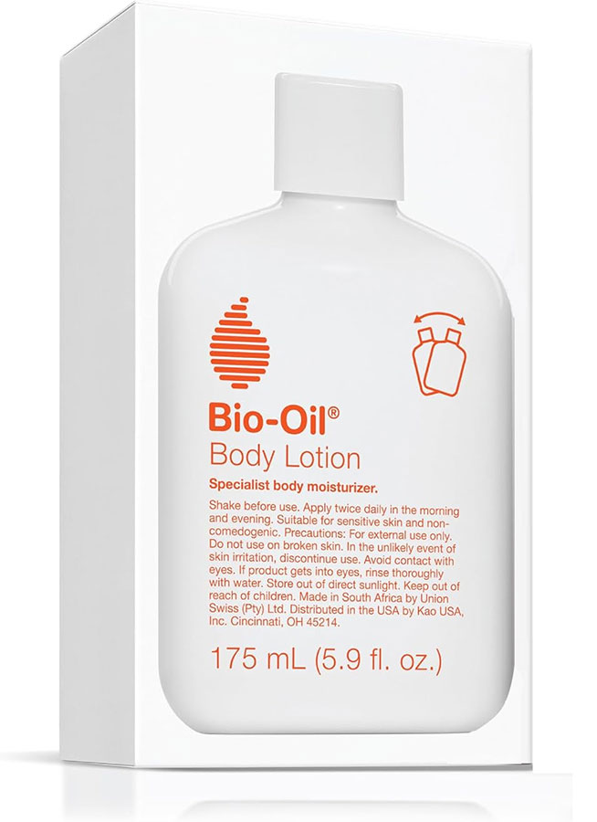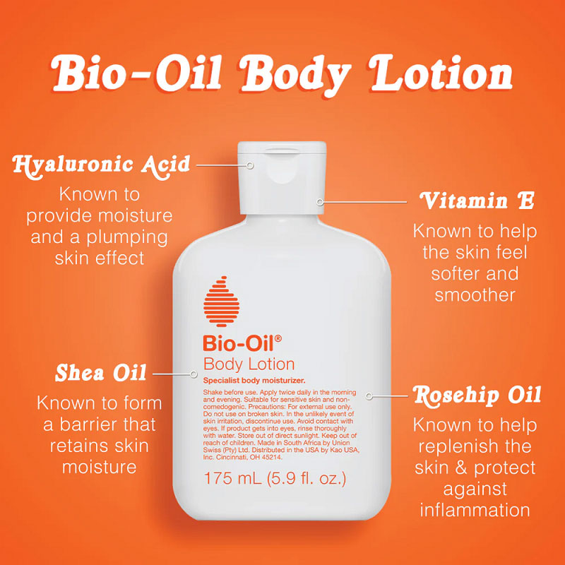 لوسیون بدن بایو اویل Bio Oil Body Lotion دارای فرمول آبرسان قوی برای رفع علائم خشکی و پوسته پوسته شدن پوست، مقابله با عوامل محیطی و تغییرات آب و هوایی و افزایش 4 برابری سطح رطوبت پوست در طی 4 هفته استفاده می باشد. لوسیون بایو اویل دارای بافت سبک دوفاز است که یک فاز آن حاوی 43 درصد روغن های ترمیم کننده و مغذی و فاز دیگر حاوی امولسیون رطوبت رسان 5 درصد اوره است. این لوسیون به منظور تکمیل روغنهای طبیعی پوست برای حفظ رطوبت و کاهش سرعت از بین رفتن آب به طور طبیعی از طریق سطح پوست فرموله شده است و ترکیب آن شامل روغن رزهیپ (دانه گل رز) برای پر کردن مجدد فربگی پوست و محافظت در برابر التهاب، قرمزی و گرگرفتگی است. دیگر مواد موثر کلیدی شامل هیالورونیک اسید برای آبرسانی قوی، روغن شی برای ایجاد لایه حفظ کننده رطوبت و ویتامین ای برای محافظت آنتی اکسیدانی و مقابله با رادیکال های آزاد می باشد.