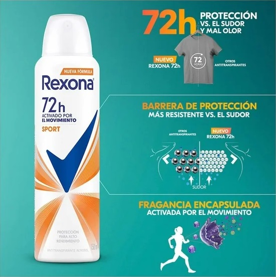 اسپری ضدتعریق رکسونا Rexona Sport 72H دارای فرمول تقویت شده و توسعه یافته 72 ساعته برای حفظ خشکی و تازگی زیر بغل به همراه مراقبت ویژه و خنثی کننده بوی عرق در طول فعالیت ورزشی می باشد. اسپری ضدتعریق رکسونا همچنین دارای تکنولوژی موشن سنس و فعال شونده با حرارت بدن برای محافظت کامل از خشکی زیربغل در حرکت و پاسخ مناسب در فعالیت های مختلف روزانه است.