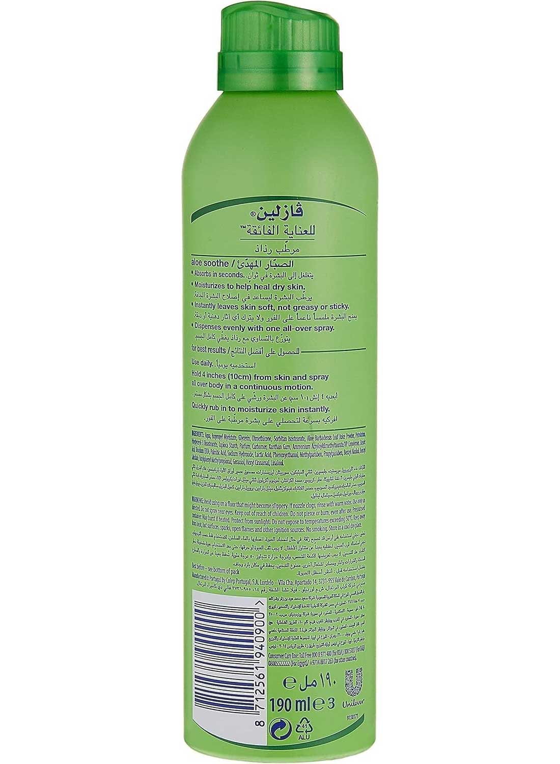 اسپری آبرسان و تسکین دهنده بدن وازلین Vaseline Aloe Soothe دارای طراحی ویژه برای استفاده آسان و سریع و جذب شوندگی فوری با عملکرد مشابه لوسیون بدن می باشد. اسپری وازلین بدون احساس چرب شوندگی و یا چسبندگی بوده و به طور یکنواخت بر روی پوست بدن پخش می شود. فرمول آبرسان وازلین حاوی میکروذرات ژل وازلین، گلیسیرین و عصاره آلوئه ورا برای تسکین بخشی، شاداب کننده و حفظ رطوبت در بافت پوست می باشد و رطوبت پوست را در طول روز حفظ می کند.
