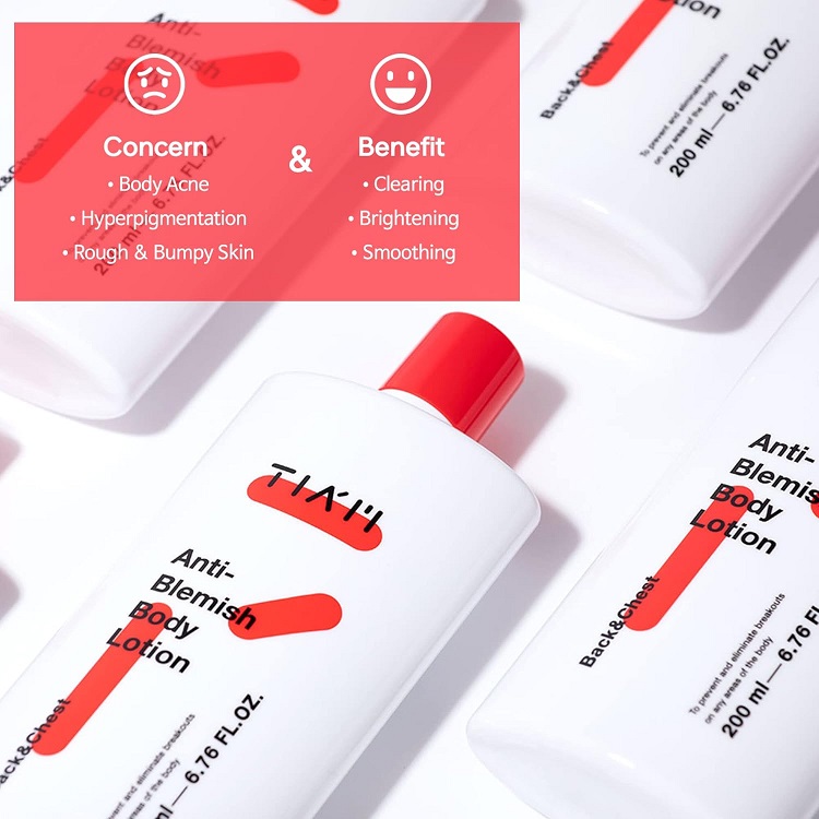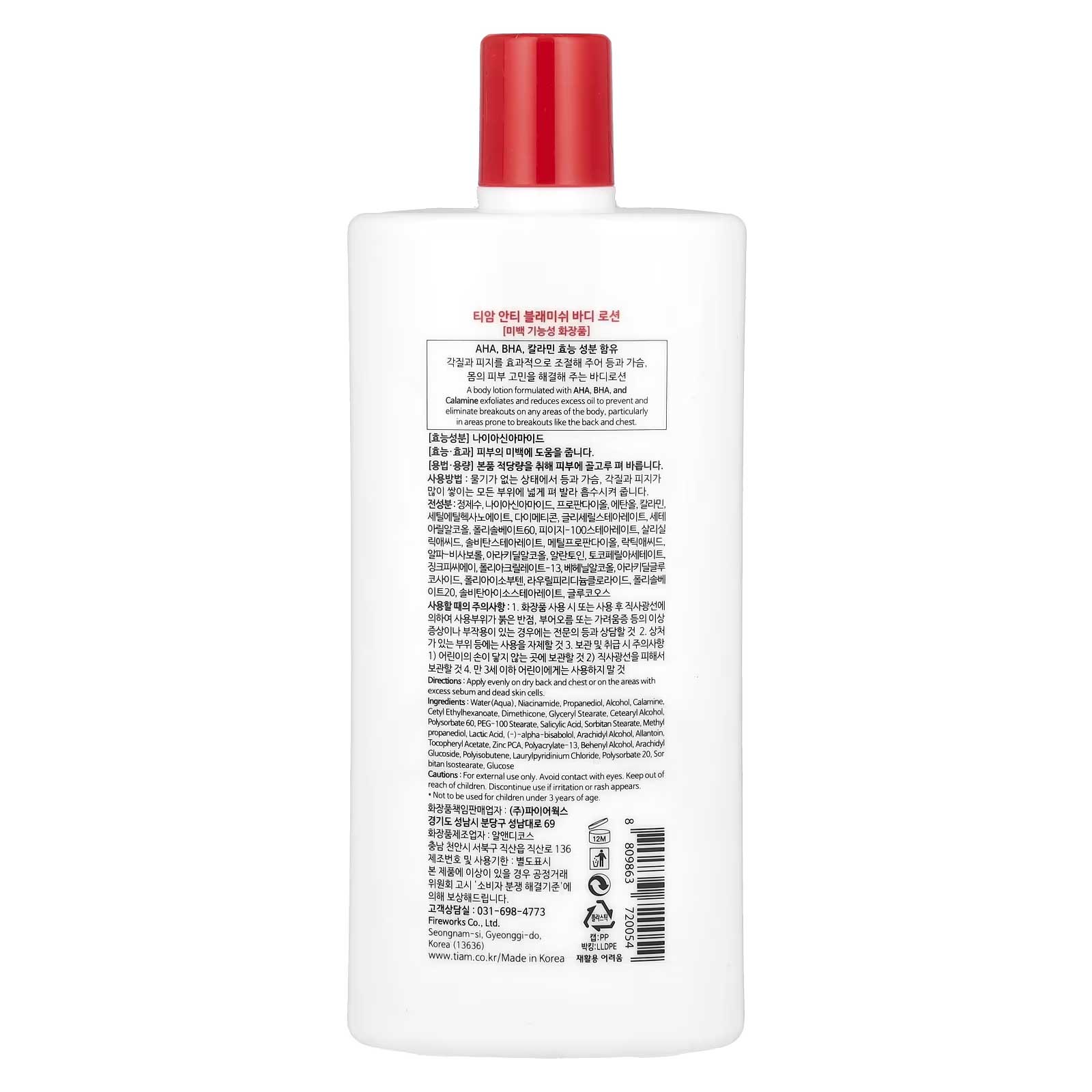 لوسیون ضدجوش بدن تیام Tiam Anti Blemish دارای فرمول ویژه برای رفع جوش و جلوگیری از ایجاد جوش بر روی تمام قسمت های بدن از جمله پشت، روی سینه، بازوها و گردن می باشد. لوسیون تیام حاوی ماده معدنی کالامین با خاصیت تسکین بخشی التهاب و قرمزی، کوچک کردن منافذ باز پوست و خشک کردن سریع تر جوش ها است، این لوسیون همچنین حاوی اسیدهای لایه بردار AHA و BHA شامل لاکتیک اسید و سالیسیلیک اسید برای پاکسازی سلول های مرده و حذف چربی اضافی سبوم که منجر به تولید جوش می شود است. ماده موثر دیگر این ترکیب نیز نیاسین آمید (ویتامین B3) برای محو کردن جای جوش و رفع لک است و پوستی یکدست و شفاف را به ارمغان می آورد.
