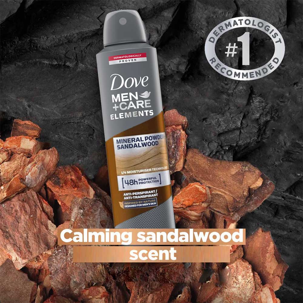 اسپری ضد تعریق آقایان داو مینرال رایحه چوب صندل Dove Mineral Sandalwood حاوی مواد معدنی به عنوان دئودورانت طبیعی برای جذب خیسی و بوی عرق به همراه رایحه دلپذیر چوب صندل می باشد. اسپری داو همچنین حاوی یک چهارم کرم مرطوب کننده برای حفظ لطافت پوست است و محافظت کننده 48 ساعته خشکی و تازگی زیر بغل در طول روز می باشد.