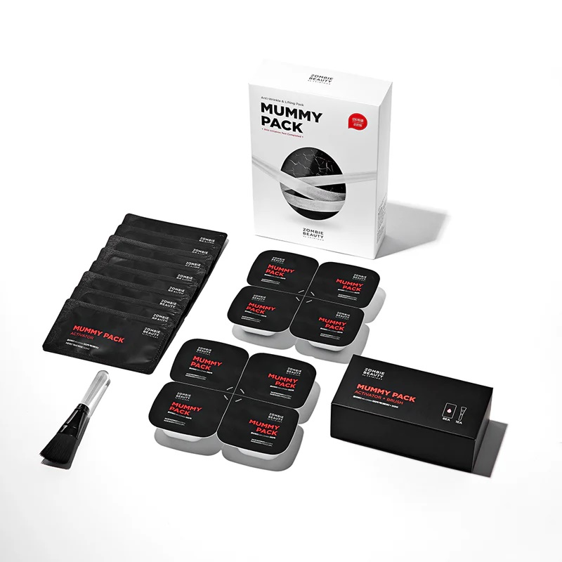 کیت ماسک ضد چروک و لیفتینگ زامبی بیوتی Mummy Pack دارای عملکرد درمانی چند منظوره از جمله جوانسازی، کاهش چروک، افزایش خاصیت ارتجاعی، روشن کنندگی و متعادل سازی چربی منافذ پوست می باشد. کیت ماسک مامی پک حاوی پروتئین آلبومین بدست آمده از سفیده تخم مرغ برای پاک کنندگی منافذ و افزایش انعطاف پذیری پوست است، این ماسک همچنین حاوی عصاره قارچ ترافل با عملکرد جوانسازی سلولی، عصاره بلوبری و انگور فرنگی سیاه غنی از آنتی اکسیدان های محافظت کننده پوست و پودر زغال برای جذب چربی اضافی و متعادل سازی سطح رطوبت و چربی پوست است.