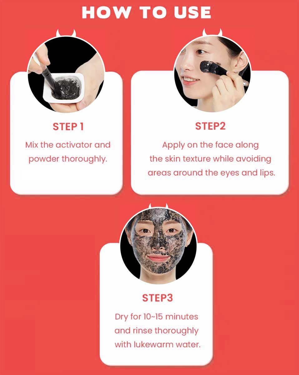 نحوه استفاده: هفته ای 1 تا 2 بار یک ساشه فعالساز (اکتیواتور) را درون یک بسته پودر ماسک ریخته و توسط برس موجود در کیت آن را هم میزنیم تا یکنواخت شده و سپس توسط برس ماسک را بر روی صورت پخش می کنیم، 10 تا 15 دقیقه صبر می کنیم و سپس با آب گرم آبکشی می کنیم.