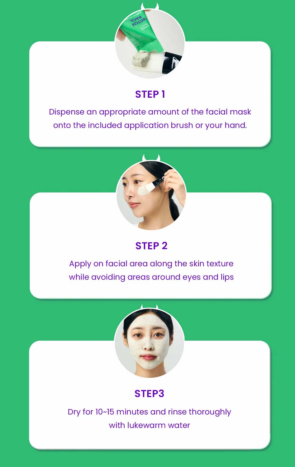 نحوه استفاده: هفته ای 1 تا 2 بار محتوای یک بسته ماسک را توسط برس موجود در کیت بر روی صورت پخش می کنیم، 10 تا 15 دقیقه صبر کرده و سپس با آب ولرم آبکشی می کنیم.
