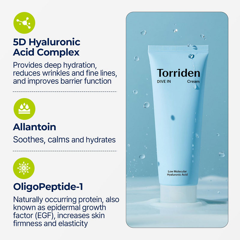 کرم توریدن Torriden Dive In Cream دارای فرمول آبرسان قوی به همراه بافت سبک برای رفع علائم خشکی، حجیم سازی پوست و افزایش سطح رطوبت در لایه های عمقی اپیدرم می باشد. کرم توریدن حاوی 5 نوع هیالورونیک اسید با وزن های ملکولی متفاوت برای نفوذ عمقی به لایه های زیرین پوست و ایجاد شبکه سه بعدی از ارتباطات میان سلولی به منظور افزایش سفتی و انعطاف پذیری بافت پوست است. فرمول این کرم همچنین حاوی آلانتوئین برای افزایش ماندگاری رطوبت و تسکین پوست و پروتئین OligoPeptide-1 که به طور طبیعی در پوست تولید می شود برای افزایش قابلیت ارتجاعی و نمای جوان پوست می باشد.