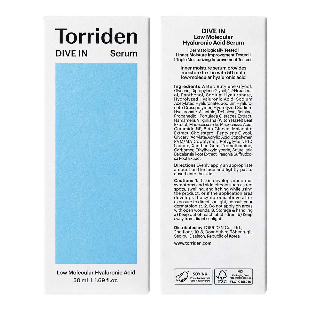 سرم آبرسان هیالورونیک اسید توریدن Torriden Dive In Serum دارای فرمول آبرسان قوی به همراه بافت سبک برای رفع علائم خشکی، حجیم سازی پوست و افزایش سطح رطوبت در لایه های عمقی اپیدرم می باشد. سرم توریدن حاوی 5 نوع هیالورونیک اسید با وزن های ملکولی متفاوت برای نفوذ عمقی به لایه های زیرین پوست و ایجاد شبکه سه بعدی از ارتباطات میان سلولی به منظور افزایش سفتی و انعطاف پذیری بافت پوست است. فرمول این سرم همچنین حاوی آلانتوئین برای افزایش ماندگاری رطوبت و تسکین پوست و ماده موثر ترهالوز برای القای اتوفاژی و تقویت قابلیت خود ترمیم گری طبیعی پوست می باشد.