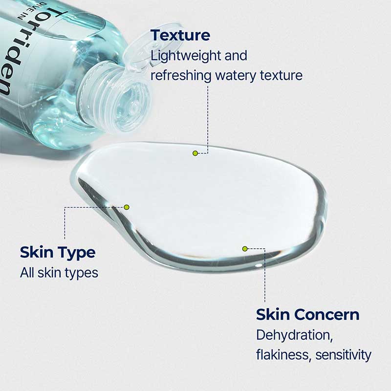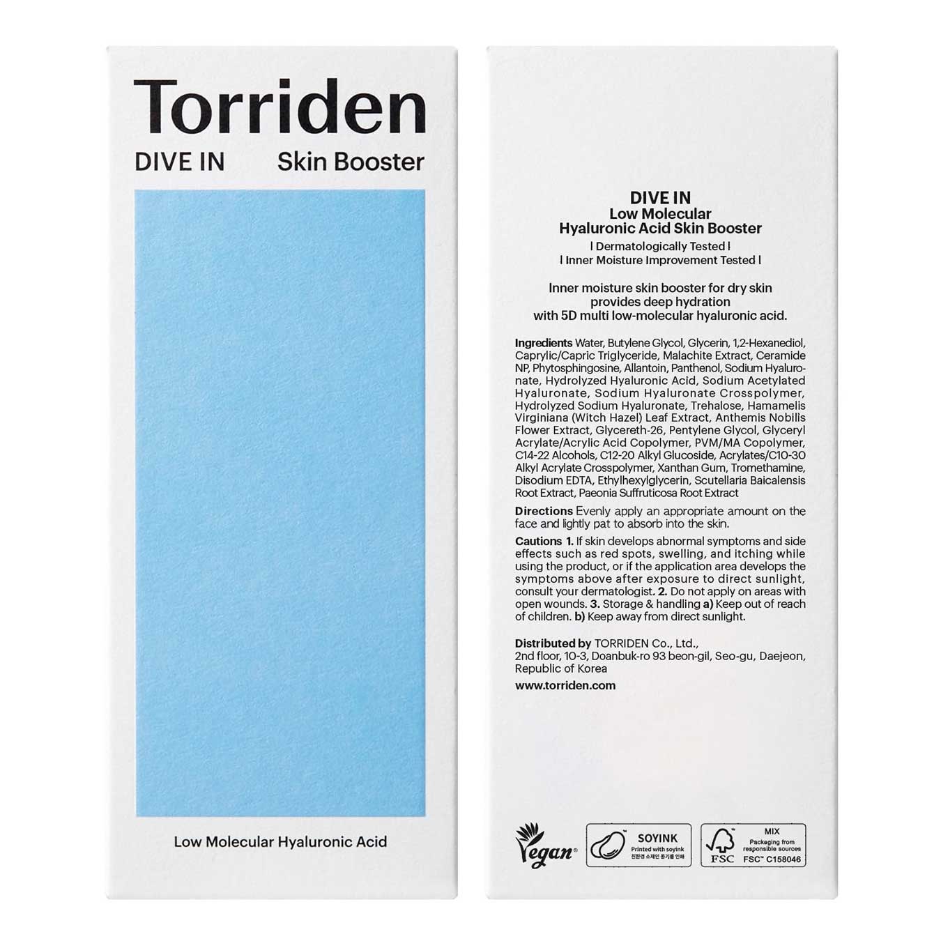 تونر آبرسان هیالورونیک اسید توریدن Torriden Dive In Toner دارای فرمول آبرسان قوی به همراه بافت سبک برای رفع رطوبت رسانی، متعادل سازی pH پوست پس از شستشو و بهبود بافت پوست می باشد. تونر توریدن حاوی 5 نوع هیالورونیک اسید با وزن های ملکولی متفاوت برای نفوذ عمقی به لایه های زیرین پوست و ایجاد شبکه سه بعدی از ارتباطات میان سلولی به منظور افزایش سفتی و انعطاف پذیری بافت پوست است. فرمول این سرم همچنین حاوی آلانتوئین برای افزایش ماندگاری رطوبت و تسکین پوست و پنتنول برای برای ترمیم و بازسازی پوست می باشد.