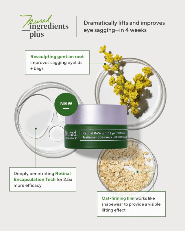 کرم ضد چروک و لیفتینگ دور چشم رتینول دکتر مورد Murad Retinal ReSculpt دارای فناوری نسل بعد کرم های زیبایی برای کاهش چروک های عمیق، افزایش سفتی و لیفتینگ پلک های افتاده و بهبود خاصیت ارتجاعی پوست اطراف چشم می باشد. این کرم حاوی فرم Type A رتینول به عنوان یکی از قوی ترین اشکال ویتامین A برای است که در یک سیستم تحویل دهنده عمقی کپسوله سازی شده و به کمک این روش به لایه های زیرین پوست نفوذ کرده و در آنجا مواد موثر آزادسازی می شوند، به کمک این فناوری میزان اثربخشی آن 2.5 برابر بیشتر می شود. مواد موثر دیگر کرم رتینال دکتر مورد شامل عصاره ریشه گیاه جنتیان (گل سپاسی) برای بهبود شل شدگی و افتادگی پلک و کاهش پف زیر چشم و همچنین عصاره جوی دوسر با اثر سفت کنندگی فوری و پیوسته دور چشم می باشد.