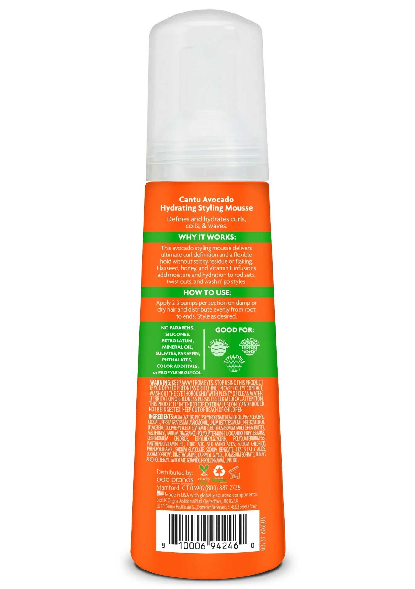 موس حالت دهنده موهای فر آووکادوی کانتو Cantu Avocado Mousse دارای بافت فوم و حاوی عصاره های طبیعی مغذی با دو عملکرد حالت دهی و رطوبت رسانی برای ایجاد موهای خوش حالت و هیدراته در طول روز می باشد. این موس حاوی روغن آووکادو برای رفع وز مو، روغن دانه کتان برای تغذیه و عسل برای ترمیم و حفظ رطوبت مو است. علاه بر این ویتامین ای برای سالم نگه داشتن فرهای زیبا و ایجاد حالتی نرم و مشخص به این فرمول اضافه شده است.