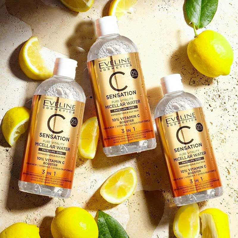 میسلار واتر اولاین Eveline C Sensation دارای فرمول پاک کننده انواع آرایش از جمله آرایش ضدآب و مناسب برای استفاده صورت، لب ها و دور چشم می باشد. این میسلار واتر حاوی کمپلکس آنتی اکسیدانی به همراه 10 درصد کنستانتره ویتامین سی برای روشن کنندگی و شادابی صورت است. مواد موثر دیگر این میسلار شامل فرولیک اسید برای روشن کنندگی و تنظیم ترشح چربی سبوم پوست های چرب، عصاره میوه یوزو ژاپنی از خانواده مرکبات برای برای روشن کنندگی، احیاکنندگی و نوسازی و ویتامین ای با عملکرد محافظت کنندگی و ضدپیری است.