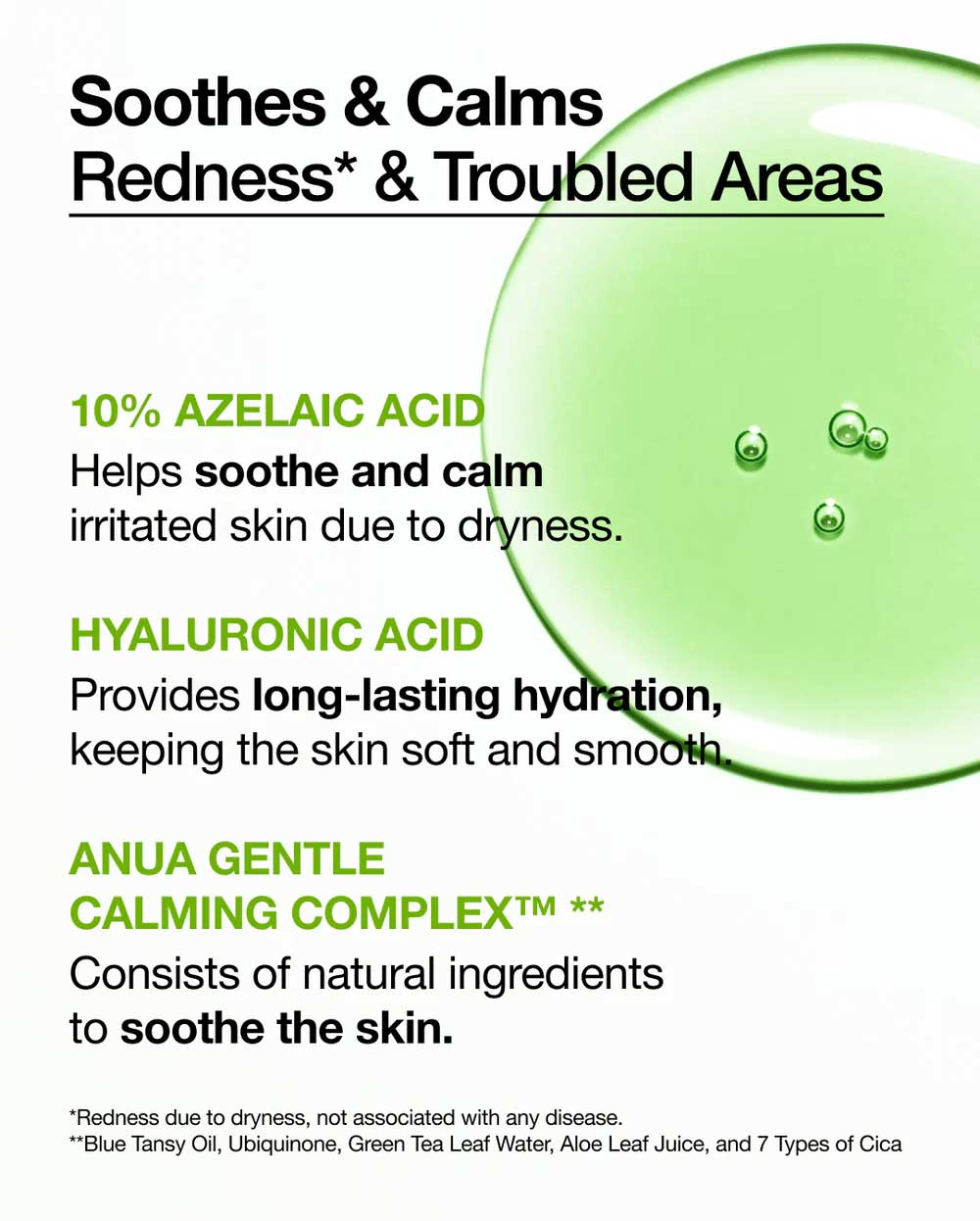 سرم ضد قرمزی و تسکین دهنده آزلاییک اسید آنوا Anua Azelaic Acid 10 دارای بافت سبک با ترکیبات تسکین دهنده و آبرسان برای کاهش قرمزی و مناسب برای پوست های حساس می باشد. این سرم حاوی 10 درصد آزلاییک اسید بدست آمده از عصاره جو و گندم برای تسکین و آرامش پوست تحریک شده و قرمز ناشی از خشکی است، فرمول این سرم همچنین حاوی عصاره آلوئه ورا و 7 گونه مختلف گیاه سنتلا آسیاتیکا (سیکا) برای ترمیم و آرامش پوست و هیالورونیک اسید برای آبرسانی قوی و رفع خشکی پوست های حساس و واکنش زا می باشد. در نتیجه سطح رطوبت پوست احیا می شود، پوست آرامش می یابد و علائم قرمزی به تدریج محو می گردد.