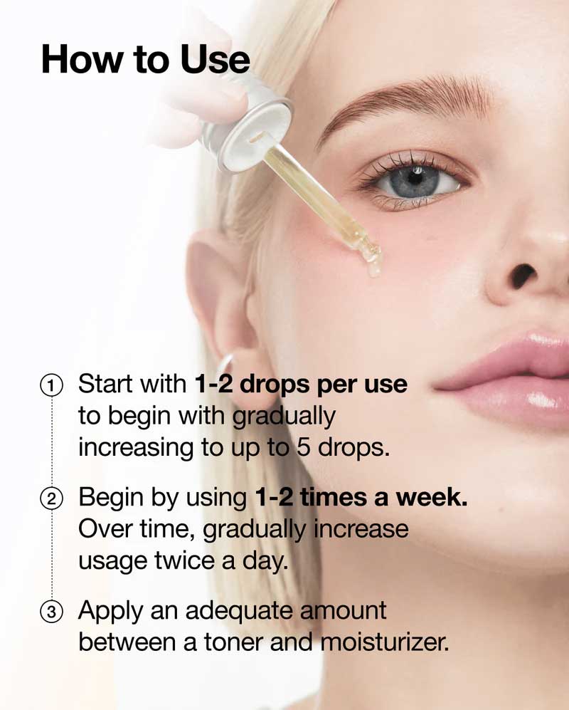 برای استفاده ابتدا هفته ای یک تا دو بار هر بار یک تا دو قطره از سرم را بر روی پوست تمیز صورت ماساژ می دهیم تا جذب شود و به تدریج میزان استفاده را به پنج قطره در روز افزایش می دهیم، در طول دوره استفاده از ضدآفتاب استفاده شود.
