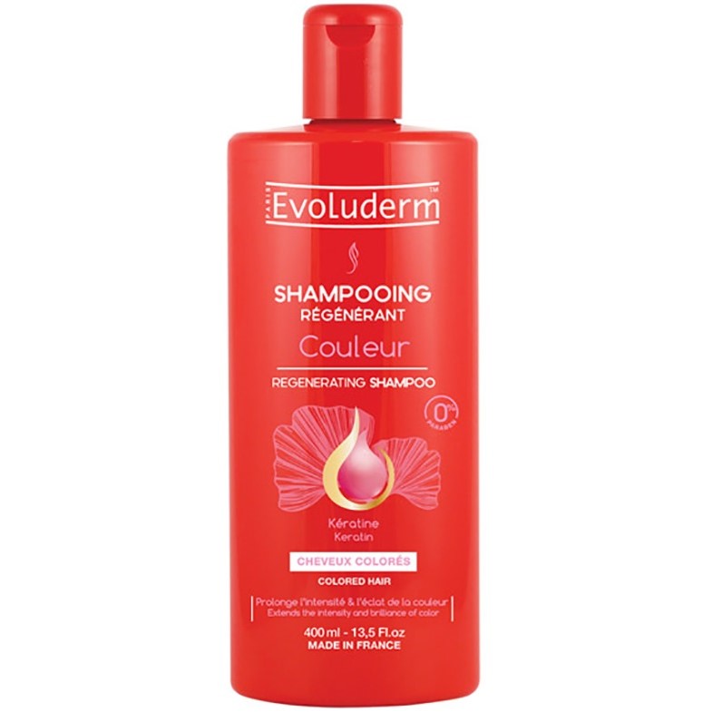 شامپو بازسازی کننده موهای رنگ شده اولودرم Evoluderm Regenerant Couleur حاوی 97 درصد عصاره های طبیعی و دارای فرمول ویژه برای افزایش شدت و درخشندگی موهای رنگ شده و بازسازی و احیای کیفیت و درخشندگی طولانی مدت موها می باشد. این شامپو حاوی آمینو اسیدهای کراتین برای ترمیم آسیب دیدگی و شکنندگی موهای نازک ناشی از رنگ کردن های مکرر است و با قرارگیری به عنوان لایه محافظ بر روی سطح مو باعث تقویت استحکام فیبر موها می شود.