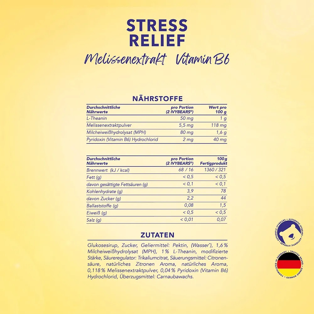 مکمل پاستیل تقویت ایمنی بدن آیوی بیرز Ivybears Boost Immune دارای فرمول حاوی کنستانتره مواد طبیعی برای رفع استرس، احساس آرامش درون و حمایت از سلامت جسم و ذهن در طول فعالیت های روزانه می باشد. این مکمل حاوی پروتئین لاکتیوم بدست آمده از شیر برای احساس آسودگی، آمینو اسید ال تیانین بدست آمده از چای و قارچ برای کاهش استرس و عصاره گیاه ملیسا (بادرنجبویه) برای رفع استرس مزمن است. این ترکیب غیر خواب آور است و به طور طبیعی به حفظ آرامش و تعادل درونی و کاهش علائم استرس کمک می کنند.