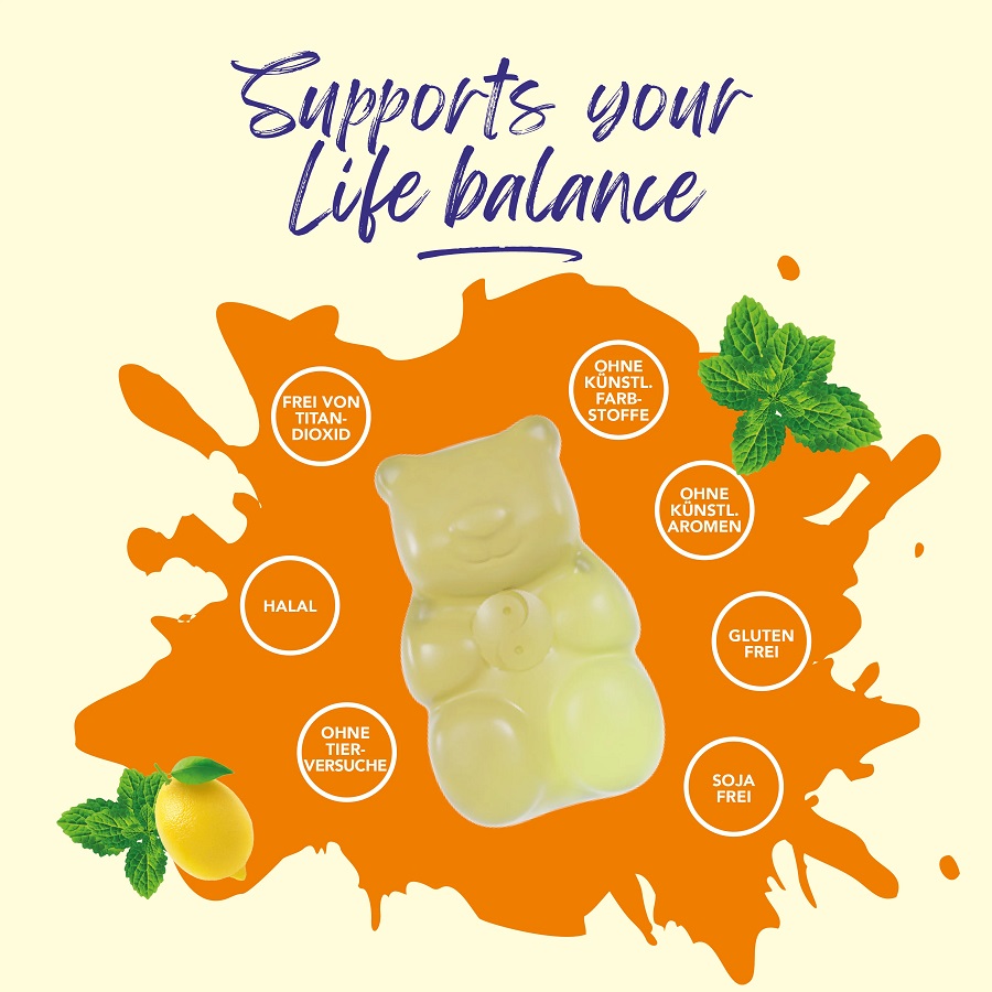 Glucose syrup, sugar, gelling agent: pectin, 1.6% milk protein hydrolysate (MPH), 1% L-theanine, modified starch, acidity regulator: tripotassium citrate, acidifier: citric acid, natural lemon flavor, natural flavor, 0.118% lemon balm extract powder, 0.04% pyridoxine (vitamin B6) hydrochloride, glazing agent: carnauba wax