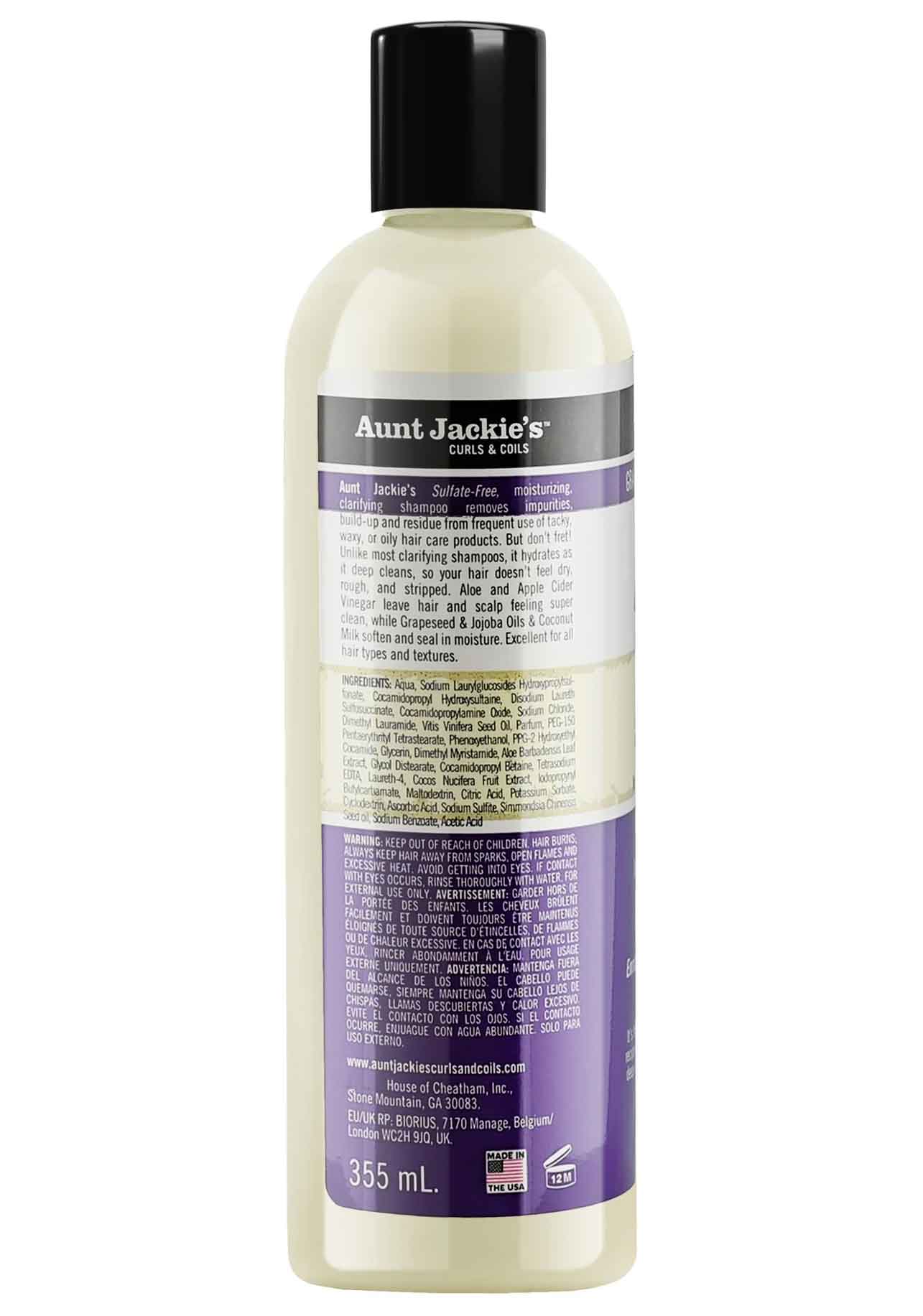 شامپو پاکسازی و رطوبت رسان موهای فر آنت جکی Aunt Jackies Power Wash دارای فرمول رطوبت رسان و شفاف کننده بدون سولفات است که ناخالصی ها و باقی مانده های مواد ناشی از استفاده مکرر از محصولات مراقبت از موی چسبنده، مومی یا چرب را از بین می برد، موها را کاملا تمیز و شفاف می کند اما در عین حال از خشک شدن موها جلوگیری می کند. تمیز شوید. این شامپو حاوی روغن هسته انگور برای تغذیه و لطافت موها، عصاره آلوئه ورا برای آبرسانی موها، سرکه پوره سیب برای پاکسازی ناخالصی ها و تصفیه مو و شیر نارگیل برای رطوبت رسانی و شادابی موهای تمیز است. این شامپو برای انواع الگوهای موهای فر و مجعد مناسب است.