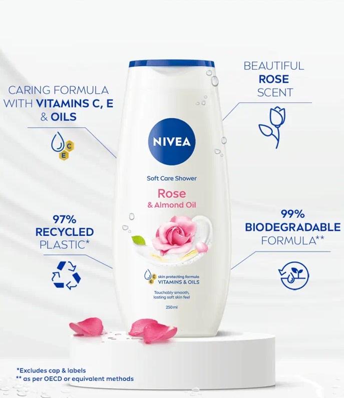 شامپو بدن گل رز و بادام نیوا Nivea Rose دارای فرمول مغذی به همراه پاک کنندگی ملایم برای ایجاد پوستی لطیف و خوشبو مانند گلبرگ های گل رز می باشد. شامپو بدن نیوا همگام با روش های توسعه پایدار و توسط 97 درصد پلاستیک بازیافت شده، 99 درصد مواد تجزیه پذیر و 100 درصد بدون تاثیر بر تغییرات اقلیمی و آب و هوایی تولید شده است. فرمول این شامپو بدن حاوی عصاره گل رز برای لطافت بخشی و تسکین پوست و روغن بادام برای تغذیه، نرمی و جلوگیری از خشکی پوست می باشد. این ترکیب همچنین حاوی ویتامین های E و C با خواص آنتی اکسیدانی، محافظت کنندگی و روشن کنندگی پوست است و به همراه رایحه دلپذیر، پوستی تمیز و خوشبو را در طول روز به ارمغان می آورد.