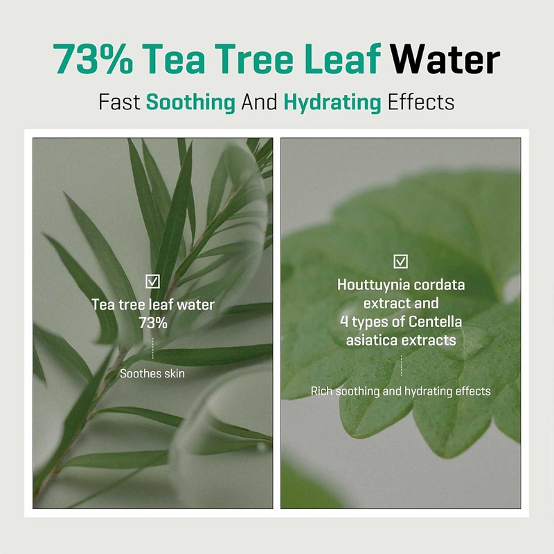 Melaleuca Alternifolia (Tea Tree) Leaf Water, Centella Asiatica Extract, Dipropylene Glycol, Niacinamide, Houttuynia Cordata Extract, Artemisia Princeps Leaf Extract, Centella Asiatica Leaf Extract, Madecassoside, Madecassic Acid, Asiaticoside, Asiatic Acid, Melia Azadirachta Leaf Extract, Melia Azadirachta Flower Extract, Salix Alba (Willow) Bark Extract, Pimpinella Anisum (Anise) Fruit Extract, Scutellaria Baicalensis Root Extract, Glycerin, Butylene Glycol, Hydroxyethyl Urea, Allantoin, Panthenol, Sodium Hyaluronate, Adenosine, Arginine, Salicylic Acid (50ppm), Tremella Fuciformis Polysaccharide, Lactobionic Acid (100ppm), Citric Acid (100ppm), C12-13 Pareth-9, Acrylates/C10-30 Alkyl Acrylate Crosspolymer, Xanthan Gum, Sclerotium Gum, Algin, Water, 1,2-Hexanediol, Benzyl Glycol, Ethylhexylglycerin, Raspberry Ketone, Disodium EDTA, Mentha Piperita (Peppermint) Oil