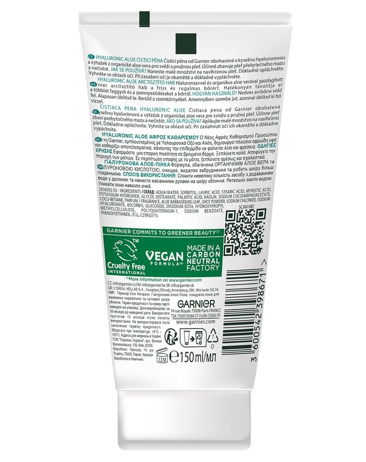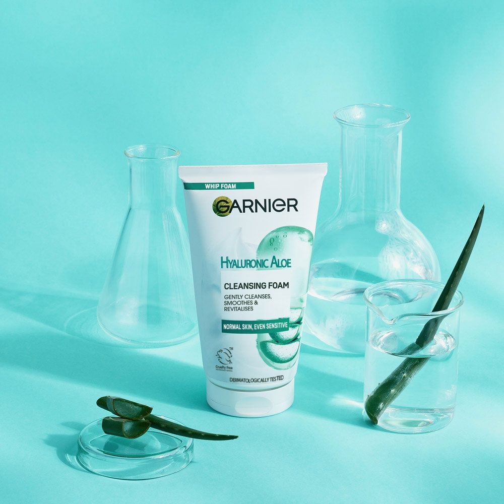 فوم شوینده صورت هیالورونیک و آلوئه ورای گارنیه Hyaluronic Aloe دارای بافت غلیظ تبدیل شونده به فوم غنی برای پاک کنندگی عمیق منافذ پوست و چربی اضافه به همراه آبرسانی و شاداب کنندگی است. این فوم شوینده حاوی هیالورونیک اسید برای آبرسانی قوی و حجیم سازی پوست و ایجاد نمای فربه تر و شاداب تر به همراه عصاره آلوئه ورای ارگانیک با خواص تسکین بخشی، طراوت بخشی و حفظ طولانی مدت رطوبت در بافت پوست است. ماده موثر دیگر این شوینده خاک رس کائولین برای جذب ناخالصی و چربی اضافه سبوم است که منجر به پاک کنندگی موثر و احیای تمیزی کامل پوست می شود.