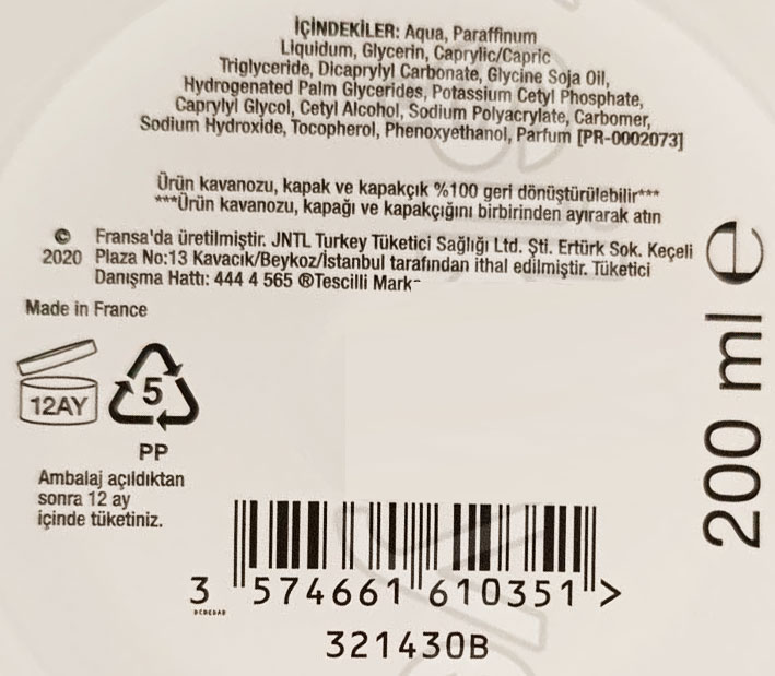 Aqua, Paraffinum Liquidum, Glycerin, Caprylic Triglyceride, Dicaprylyl Carbonate, Glycine Sja Oil, Hydrogenated Palm Glycerides, Potassium Cetyl Phosphate, Caprylyl Glycol, Cetyl Alcohol, Sodium Polyacrylate, Carbomer, Sodium Hydroxide, Tocopherol, Phenoxyethanol, Parfum