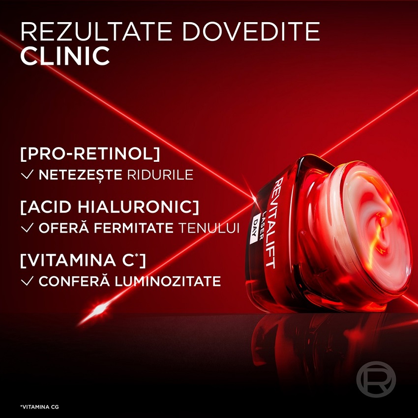 کرم ضدچروک روز لورال رویتالیفت لیزر LOreal Laser Triple Action دارای فرمول جدید و قدرتمند با سه عملکرد صاف کننده چروک ها، سفت کننده پوست و ایجاد نمای روشن تر و جوان تر صورت می باشد. کرم لیزر روز لورال حاوی هیالورونیک اسید جهت آبرسانی قوی پوست و پرو رتینول پیشرفته به عنوان ضد چروک قوی با قابلیت آزادسازی آهسته و تدریجی است که به صاف و هموار شدن سطح پوست کمک می کند. فرمول این کرم همچنین حاوی ویتامین سی با فرم CG برای اثرگذاری قوی تر و حفظ پایداری آن است که به روشن شدن پوست و کاهش لک و تیرگی کمک می کند. کمپلکس پپتید آرگایرلاین نیز برای رفع خطوط دینامیک صورت مانند خط اخم و لبخند و افزایش سفتی پوست به آن اضافه شده است، در نتیجه همانند یک جلسه لیزر درمانی پوستی صاف و جوانتر خواهیم داشت.