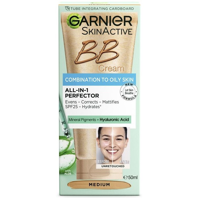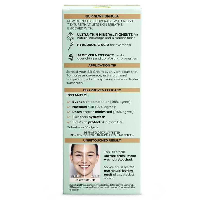 بی بی کرم مات کننده پوست چرب و مختلط گارنیه Garnier BB Oily دارای فرمول ویژه با بافت سبک برای پوست های چرب و مختلط است که به پوست اجازه تنفس می دهد و سطح یکدست با پوشش یکنواخت پوست را فراهم می کند. بی بی کرم گارنیه مزایای آرایشی را به همراه آبرسانی و محافظت پوست دارا می باشد و حاوی رنگدانه های معدنی برای پوشش لک و ایجاد نمای هموار صورت است، این ترکیب همچنین حاوی هیالورونیک اسید برای آبرسانی و شادابی صورت و عصاره آلوئه ورا برای تسکین و حفظ رطوبت پوست می باشد. این عملکرد با فیلترهای ضدآفتاب SPF25 برای محافظت روزانه پوست تکمیل می شود.