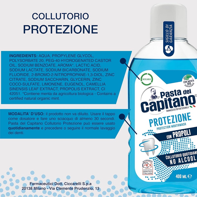 دهانشویه مراقبت لثه و دندان پاستا دل کاپیتانو Pasta Del Capitano Denti Gengive دارای ترکیب متعادل از مواد موثر فعال پروپولیس (بدست آمده از کندوی زنبور عسل) و عصاره چای سبز برای محافظت از سلامت لثه ها و تازگی بخشی تنفس است. این دهانشویه همچنین به لطف فرمول بدون الکل و عصاره نعناع ارگانیک دارای طعم دلپذیر و خنک است. مواد موثر دیگر آن شامل فلوراید و زینک برای جلوگیری از پوسیدگی و محافظت از مینای دندان است.