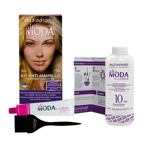کیت رنگ مو از بین برنده زردی آلتا مدا Alta Moda Yellow Remover محصولی بسیار مناسب برای افرادی است که از رنگ های بلوند و روشن استفاده می کنند و میان موهای خود تارهای مو به رنگ زرد ناخواسته مشاهده می کنند. این محصول رنگ زرد ناخواسته را از بین می برد و طیف رنگی بلوند بسیار خالص را بر جا می گذارد.