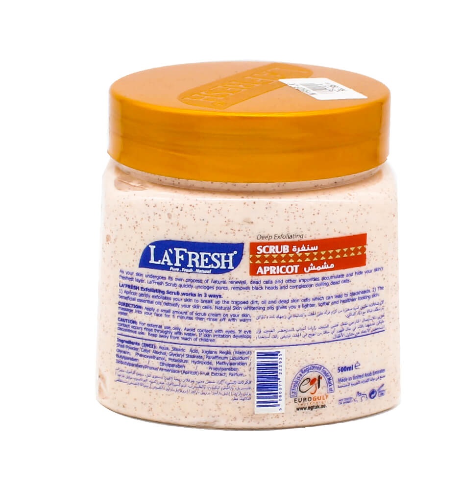 اسکراب صورت و بدن لافرش حاوی عصاره زردآلو پاک کننده کامل پوست می باشد و پوست را نرم و روشن تر می کند.