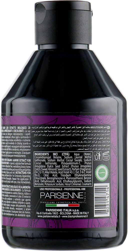 شامپو ضد زردی موهای بلوند و روشن بلک پروفشنال Black Platinum غنی شده با عصاره ارگانیک بادام بوده و برای موهای روشن، بلوند و دکلره شده مناسب می باشد. این شامپو حاوی رنگدانه های بنفش برای خنثی کردن تناژ برنجی و زرد ناخواسته میان موها است و ضمن تغذیه فیبر مو، موها را درخشان و براق می کند. شامپو پلاتینیوم بلک همچنین حاوی عصاره لیمو شیرین غنی از ویتامین های A، E، C و F برای ایجاد نمای سرزنده و شاداب موها است و موهایی باکیفیت سالنی را به ارمغان می آورد.